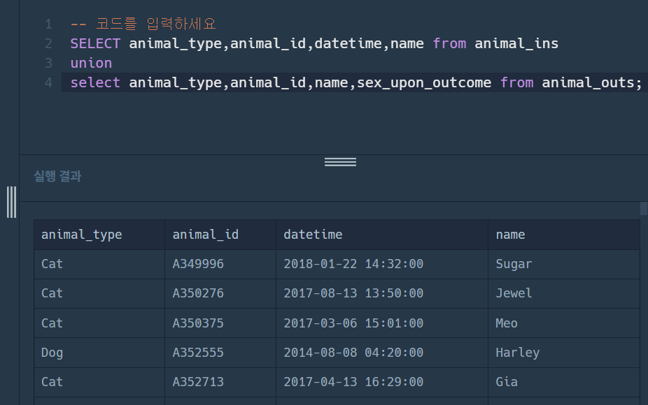 결과는 첫번째 테이블에서 명시한 칼럼명을 따름
