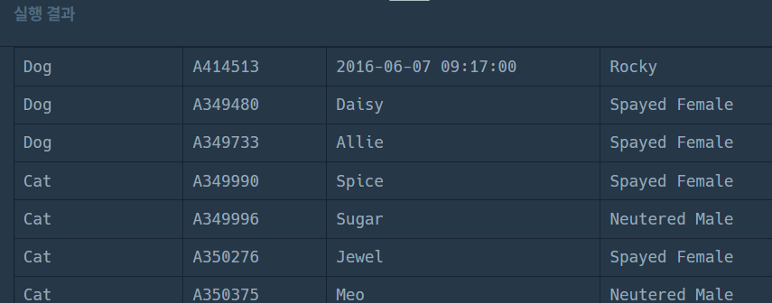 코딩테스트 연습 - 보호소에서 중성화한 동물 | 프로그래머스 스쿨