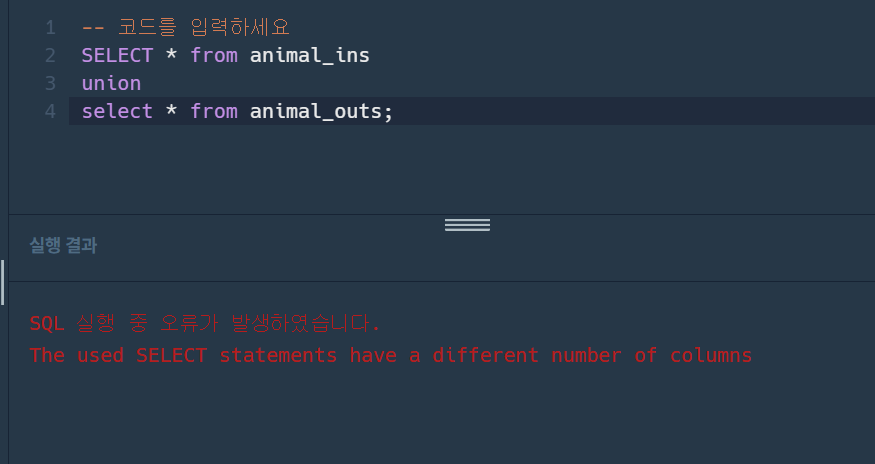 참고로 union을 할려면 두 테이블의 칼럼개수가 일치해야함