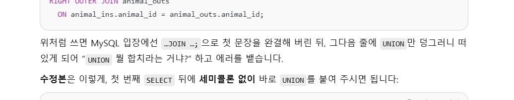 첫번째 쿼리에 ;으로 끝내버리니까, UNION이 단독 문장이라고 생각해서 에러나나봐