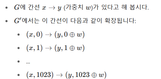 총 (N*1024)개의 정점이 있고 원래 그래프의 간선 1개당, 1024개가 생기므로, (M*1024)개의 간선을 가지는 그래프 G에서 BFS를 수행하여 찾을 수 있다.