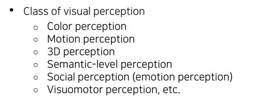 visual perception의 종류는? 색깔 인지, 움직임 인지, 사회적 감각 인지 등등 많다
