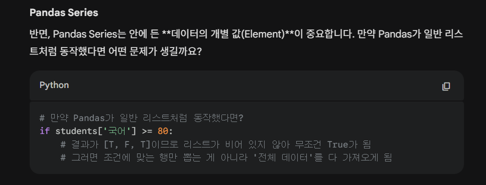 물론, python은 리스트가 비어있지 않으면 True로 보는데 pandas는 이렇게 하면 설계상으로 문제 생기니까 이렇게 만듦