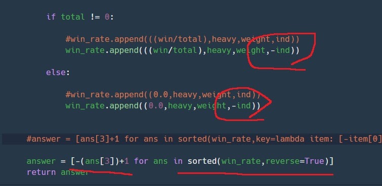 win_rate의 원소는 0번이 승률 1번이 자기보다 무거운 몸무게를 가진 복서를 이긴 횟수, 2번이 자기 몸무게, 3번이 자기 번호