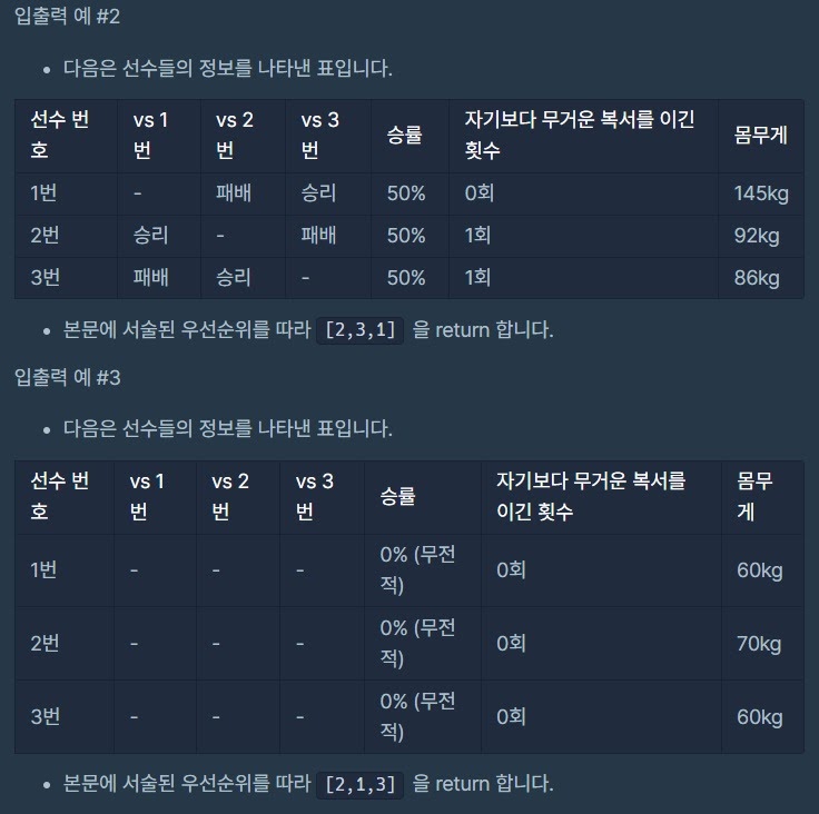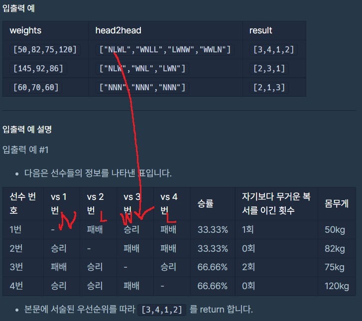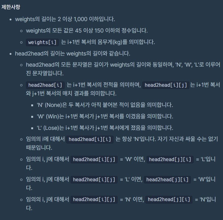 2. 승률이 동일한 복서의 번호들 중에서는 자신보다 몸무게가 무거운 복서를 이긴 횟수가 많은 복서의 번호가 앞쪽으로 갑니다.