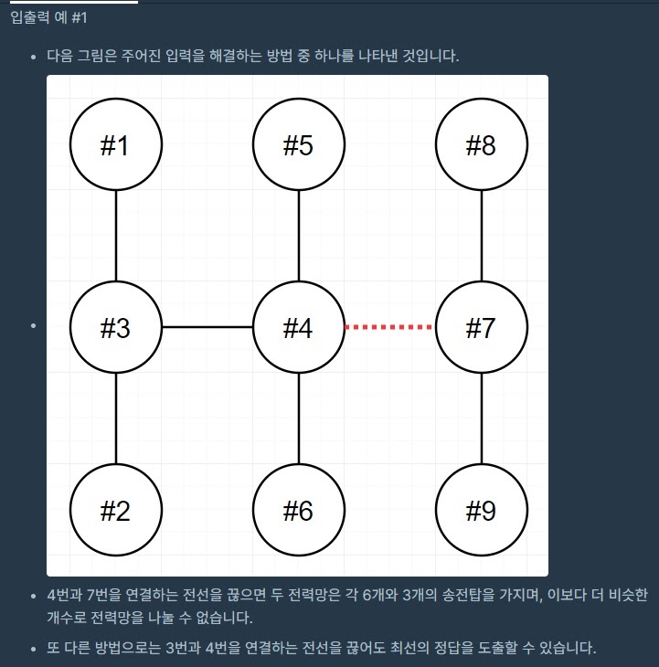 wires의 각 원소는 [v1,v2] 2개의 자연수로 이루어져 있으며 이는 전력망의 v1번 송전탑과 v2번 송전탑이 전선으로 연결되어 있다는 것