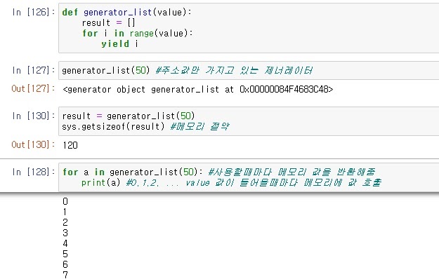 그림1과 그림2를 보면 리스트가 메모리 528인데 generator는 메모리가 120으로 매우 작다