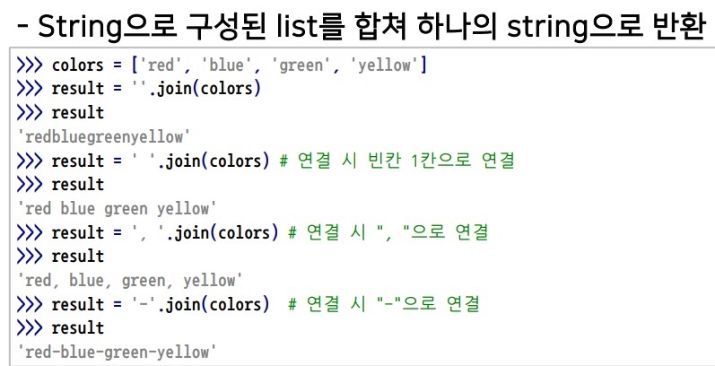 ‘(기준값)’.join(list)는 리스트를 받아서 기준값으로 리스트 원소를 이어 문자열을 반환함