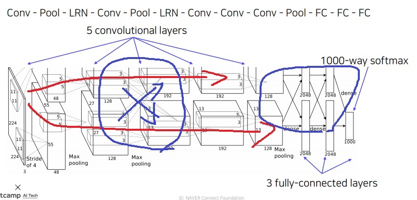 재미있는 점은 첫번째로 두개의 pass로 나눴다는 것인데 당시 GPU가 부족해서 2개의 forward pass로 나눠서 올렸다
