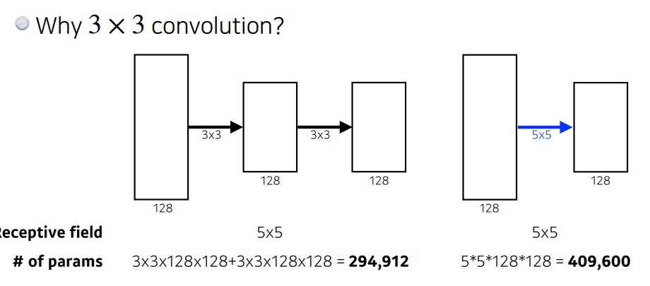 결론적으로 말하면 3*3 convolution을 여러번 사용하면 더 큰 크기의 convolution을 적게 사용한 것과 동일한 receptive field를 얻을 수 있기 때문이다.