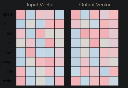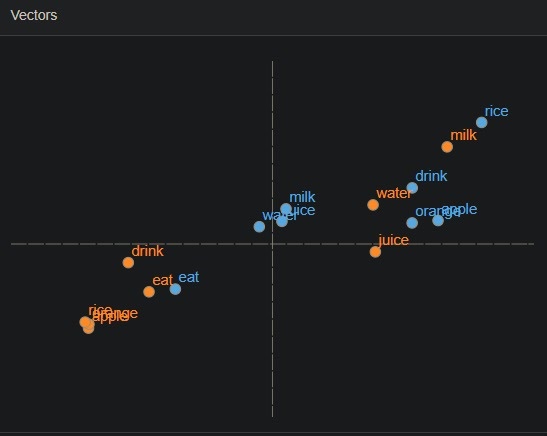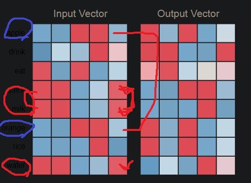 apple과 orange는 의미상 비슷하다는 것을 알고 있다. 실제 embedding결과도 비슷한 색을 보이고 있다는 것