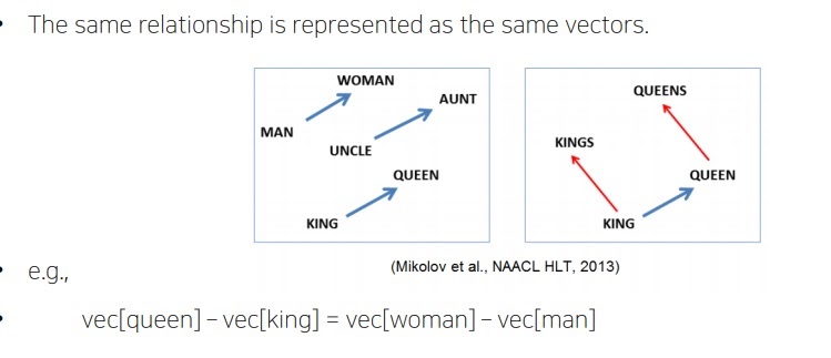Word2Vec으로 학습한 벡터들은 단어의 의미상 관계를 잘 표현하는 것으로 알려져있다.