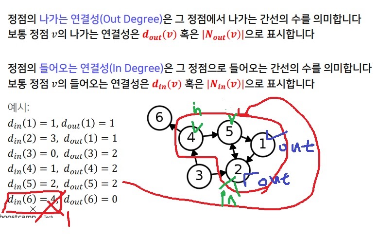 방향성이 있는 그래프의 경우 나가는 연결성(out degree)와 들어오는 연결성(in degree)을 구분한다.