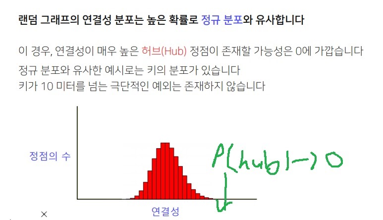 정규분포는 꼬리가 얇은 분포인데, 극단적인 점인 hub가 존재할 가능성이 낮다는 뜻이다.