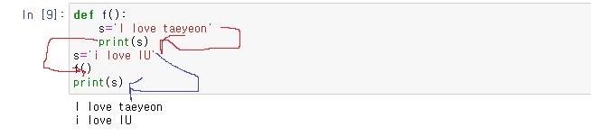 def f():는 일단 메모리에 올린 다음에 s='i love IU'를 먼저 수행함