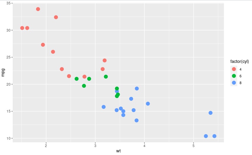 geom_point(aes(colour=factor(cyl)))로 colour안에 지정한 factor변수에 따라 요인별로 점의 색을 다르게 할 수 있다