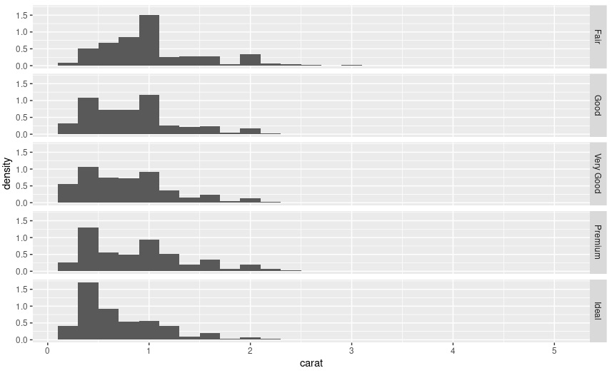 반대로 facet_grid(cut~.)을 하면 cut의 값별로 가로로 히스토그램을 나타냄