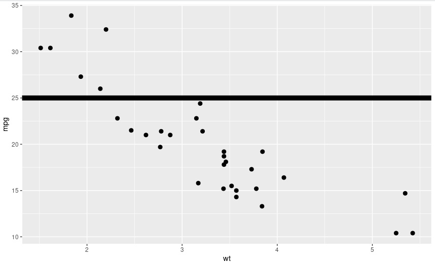geom_hline(yintercept=25,size=3.5)를 더해주면 산점도에 선의 굵기가 3.5인 y=25를 삽입