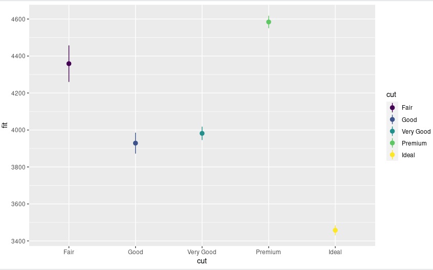 > se <- ggplot(cuts, aes(x=cut, y=fit, ymin=fit-se.fit, ymax=fit+se.fit, colour=cut))