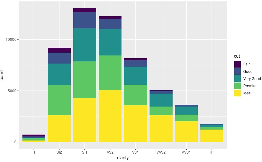 > w <- ggplot(diamonds, aes(x=clarity, fill=cut,order=desc(cut)))