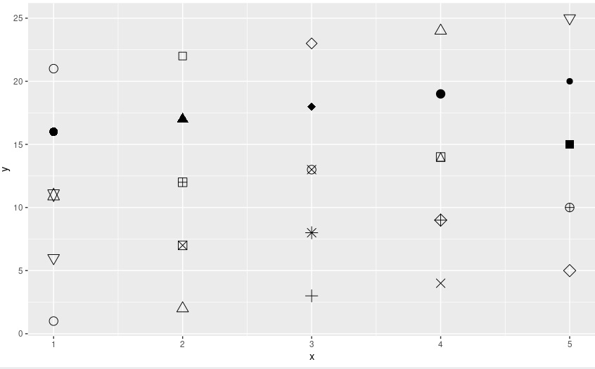 z=1:25이고 aes(shape=z)로 주면 1번부터 25번까지 점의 모양을 다르게 해서 표시함