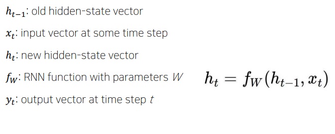 각 time step에 sequence data Xt와 전 step의 hidden state vector인 ht-1이 함께 입력으로 들어오고 현 step의 출력으로 ht를 구한다.