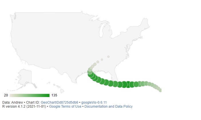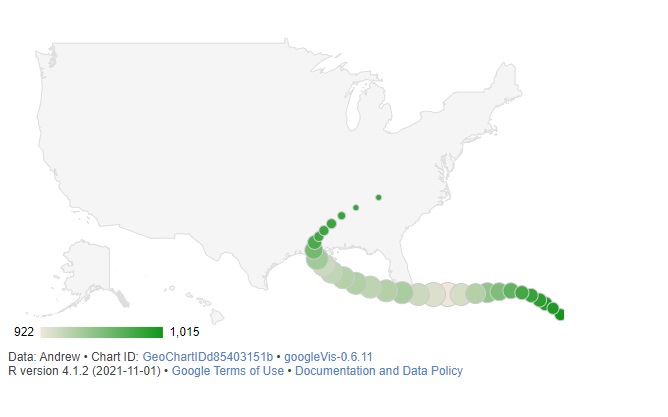 g5 <- gvisGeoChart(Andrew, 'LatLong', colorvar='Speed_kt', options=list(region='US'))