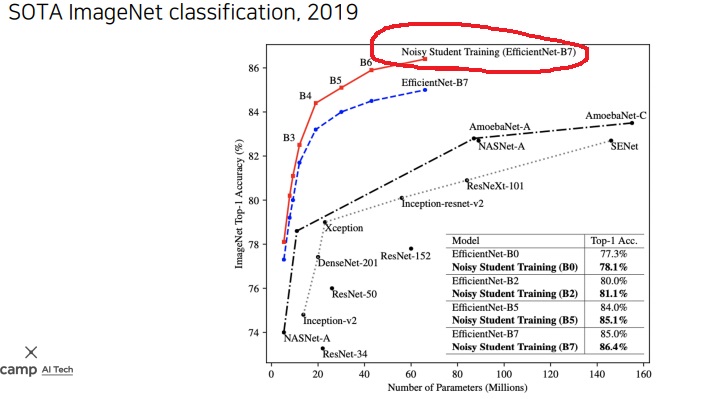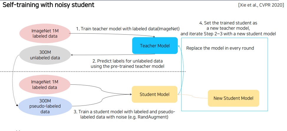 이렇게 학습시켜 기존의 supervised learning의 한계를 뛰어넘어 최근 2019 ImageNet 대회에서 압도적인 성능으로 1등을 하였다