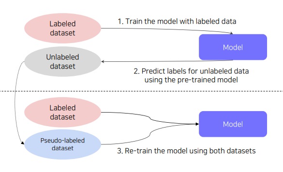사전학습에 이용한 label 데이터와 대량으로 생성한 pseudo label 데이터를 활용하여