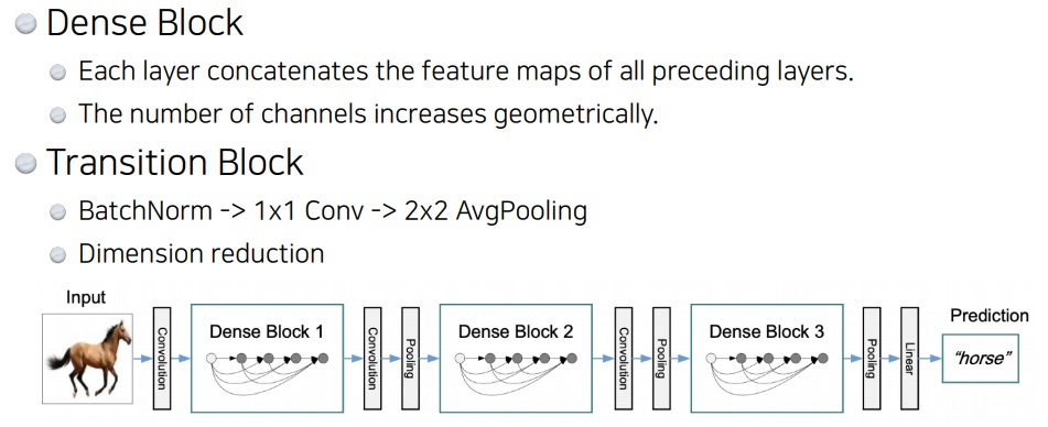 ResNet이 skip connection 방식으로 단순히 input과 output을 더했다면 DenseNet은 channel축으로 concatenation했다