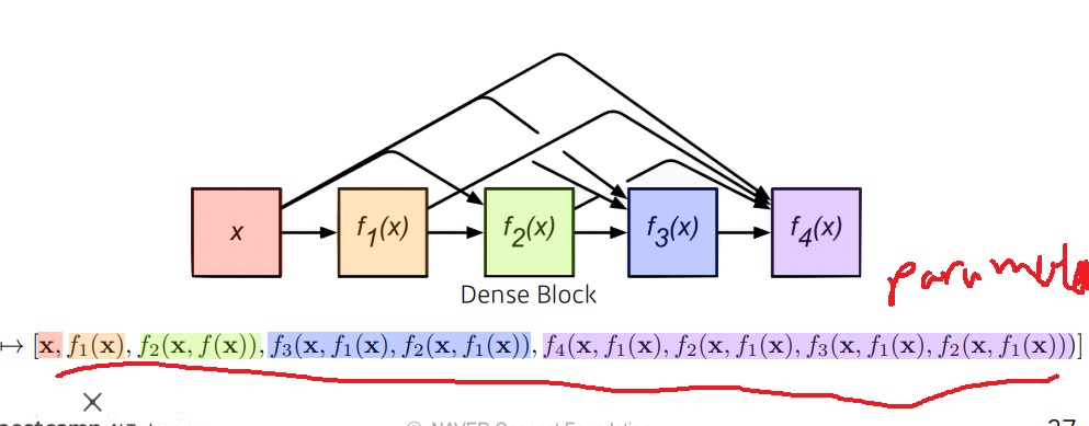 ResNet과 또 다른 차이는 단순히 이전 input만 가지고 온 것이 아니라 그 이전, 더 이전, 훨씬 이전의 input도 전부 가지고 오는 dense한 설계