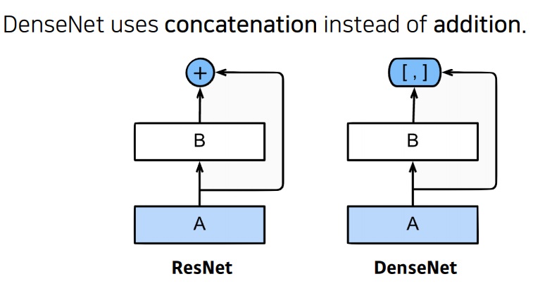 ResNet은 skip connect 과정에서 더했다면 DenseNet은 concatenation을 한다.