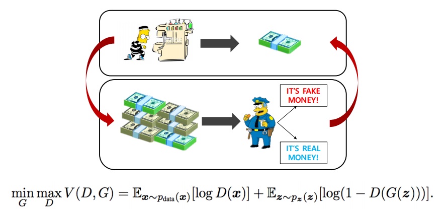 도둑(generator)이 위조지폐를 만들고 싶은데 위조지폐를 잘 구분하는 경찰(discriminator)이 있다고 가정해보자.