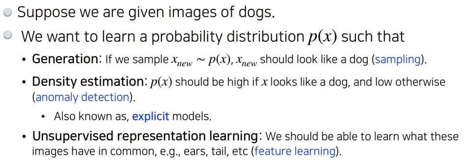 새로운 사진을 주었을 때 개랑 비슷할수록 높은 확률을 뽑아내는 density estimation, 이러한 모형을 explicit model이라 한다.
