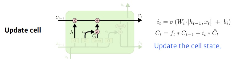 cell state에서 흐르는 정보 $C_{t-1}$을 $C_{t}$로 업데이트한다