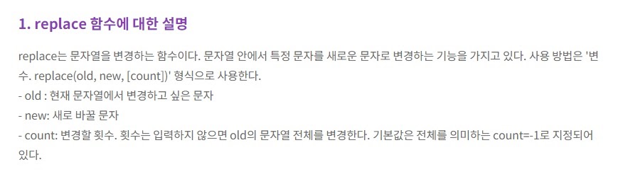 replace( ) - 순서 - 1. replace 함수에 대한 설명 2. 함수 사용예시 1. replace 함수에 대한 설명 replace는 문자열을 변경하는 함수이다. 문자열 안에서 특정 문자를 새로운 문자로 변경하는 기능을 가지고