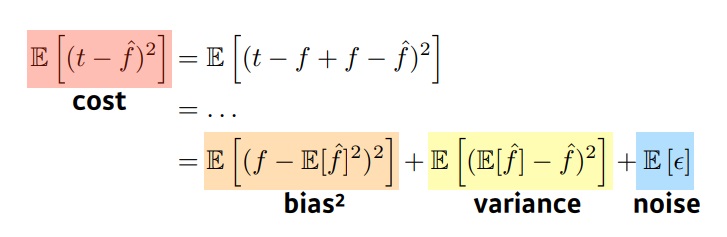 noise가 있는 데이터에서 cost는 bias의 제곱과 variance, noise의 합으로 나타난다.