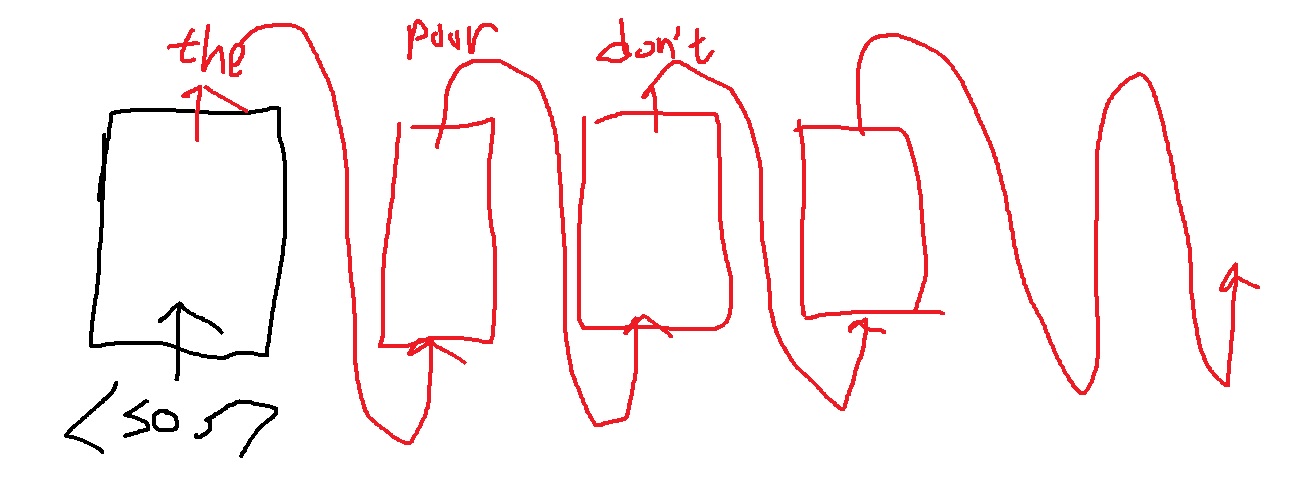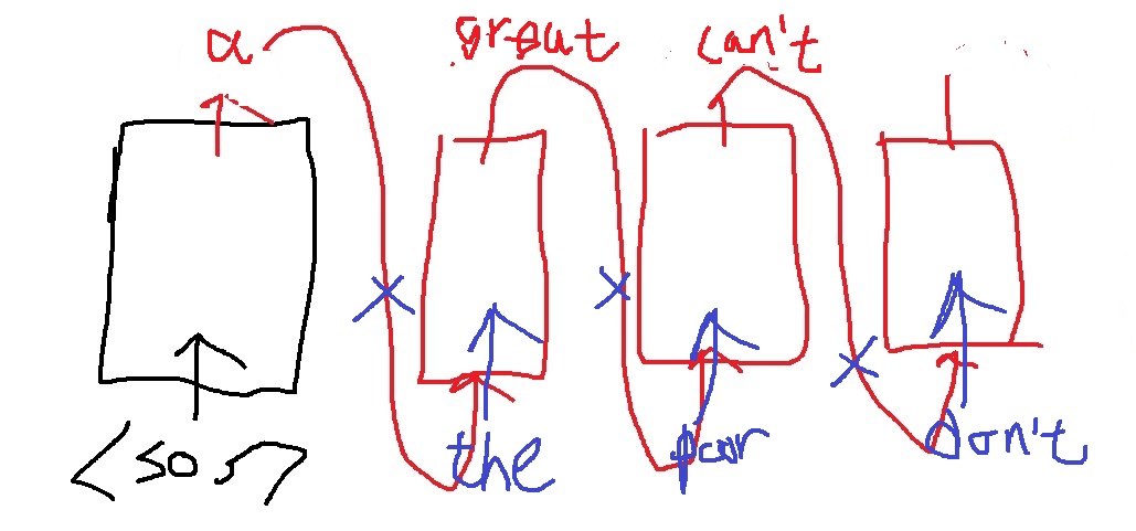 이전 단어의 예측값을 다음 단어의 예측을 위해 넣는다. 정답을 모르니까 당연한거지만