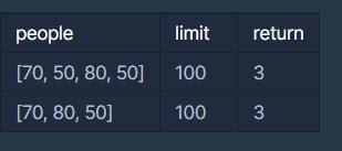 탐욕법 알고리즘으로 주어진 몸무게 리스트에서 최대 몸무게인 사람과 더 태울수 있으면 최소 몸무게인 사람을 먼저 태워야 최소로 boat를 쓴다는 것을 이해해야함