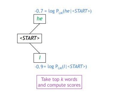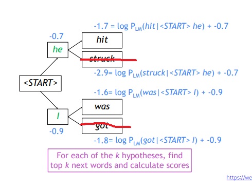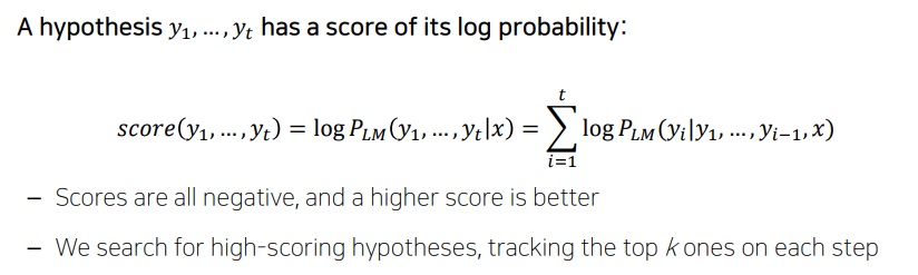 완성된 hypothesis의 최종 score는 각 step마다 계산되는 로그확률 logP(yt|y1,y2,...,yt-1,x)의 총합으로 구해진다.