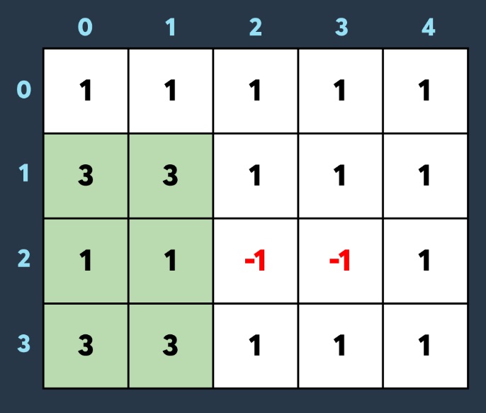 세 번째로 아군이 맵의 (1,0)부터 (3,1)까지 회복하여 2만큼 건물의 내구도를 높이면 아래와 같이 2개의 건물이 파괴되었다가 복구되고 2개의 건물만 파괴되어있는 상태가 됩니다.