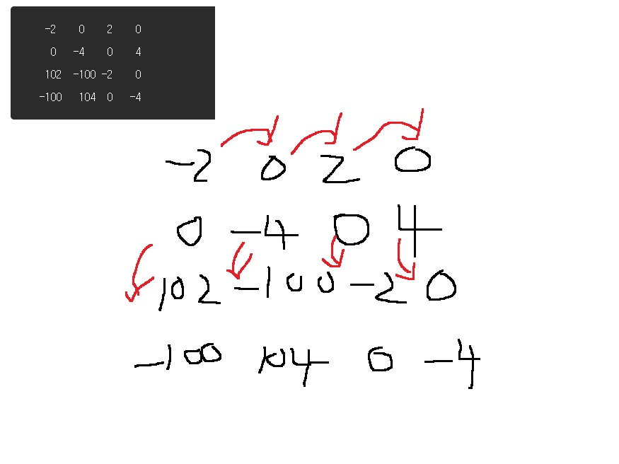 그래서 배열의 (0,0)과 (2,2)에 -2를 배열의 (0,2)와 (2,0)에 2만큼 변화를 준다