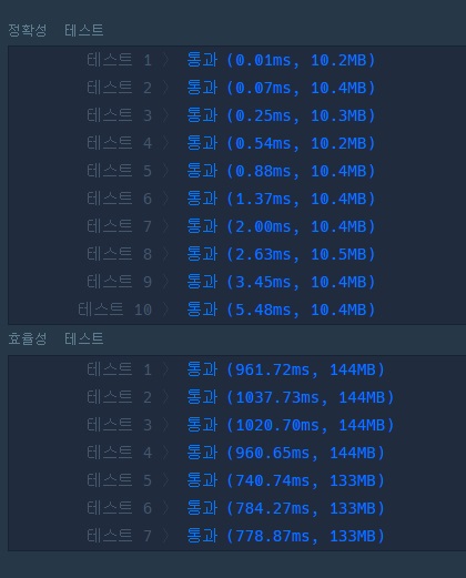하지만 정확도 테스트는 통과하지만 효율성 테스트를 통과하지 못한다