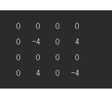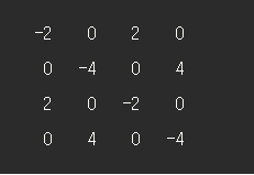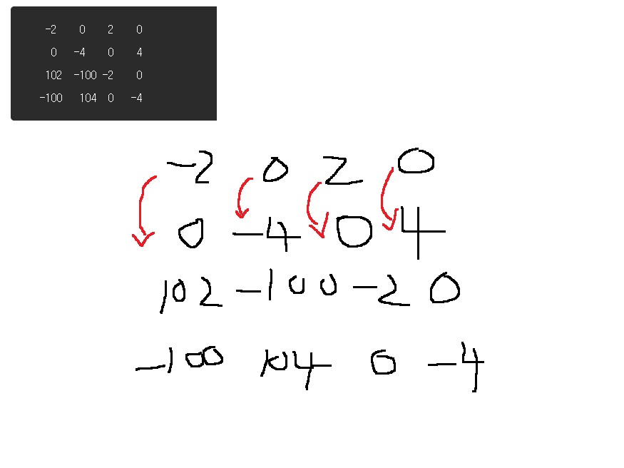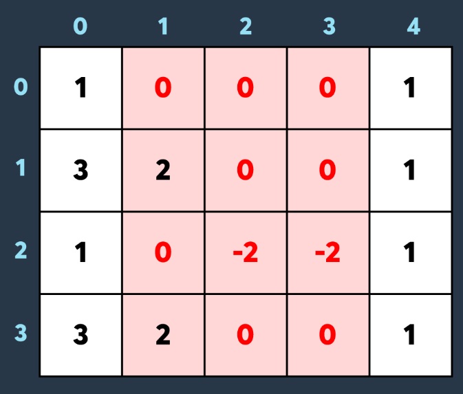1. (1,1)부터 (2,2)까지 -4만큼의 변화를 줘야 합니다. 위에서 설명한 공식대로 (1,1)과 (3,3)에 -4, 배열의 (1,3)과 (3,1)에 4만큼의 변화를 줍니다.
