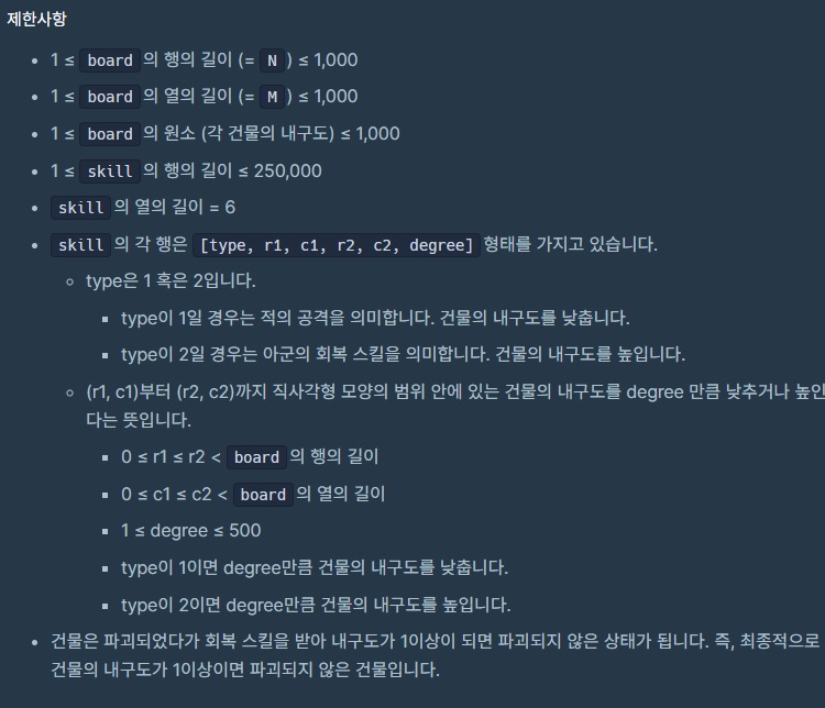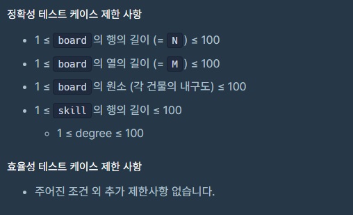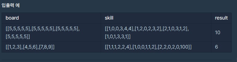 건물의 내구도를 나타내는 2차원 정수 배열 board와 적의 공격 혹은 아군의 회복 스킬을 나타내는 2차원 정수 배열 skill이 매개변수로 주어집니다.