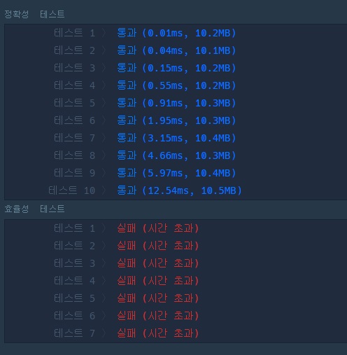 하지만 정확도 테스트는 통과하지만 효율성 테스트를 통과하지 못한다