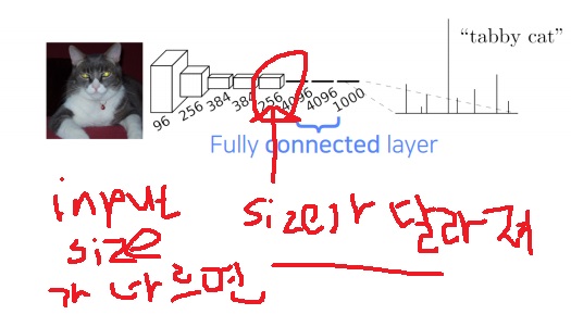 학습과정에서 사용한 이미지와 다른 size를 가진 image를 넣으면 마지막 fully connected layer에 들어가질 못한다