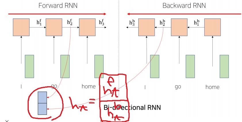 home go i의 backward RNN은 i를 hidden vector로 바꿀 때 home go의 정보를 받으면서 바꿀 수 있다.