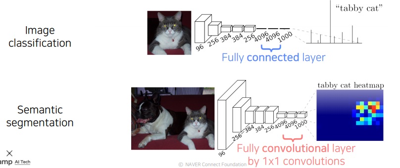 기존 네트워크의 문제점은 output이 하나의 벡터로 나와 이미지 map의 pixel classification을 하기에 부족하다