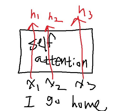 input sequence x1,x2,x3가 self attention을 지나 바로 encoding되어 h1,h2,h3의 hidden vector가 된다.